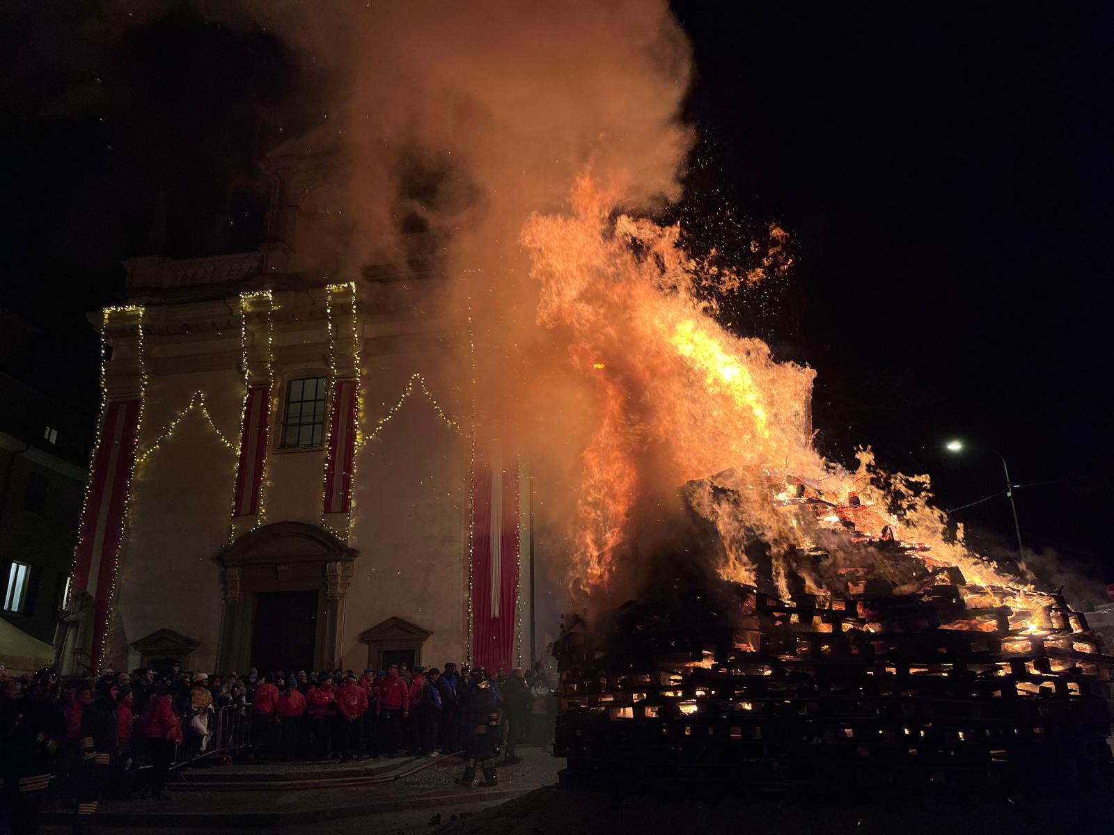 Durante tutto il giorno sarà inoltre possibile portare i bigliettini e metterli nella pira in costruzione con i propri desideri per l’anno nuovo. Alle ore 21 ha inizio la processione e l’accensione del falò. L’accensione è accompagnata da un concerto di campane, grazie alla tastiera antica restaurata dai Monelli negli anni scorsi.